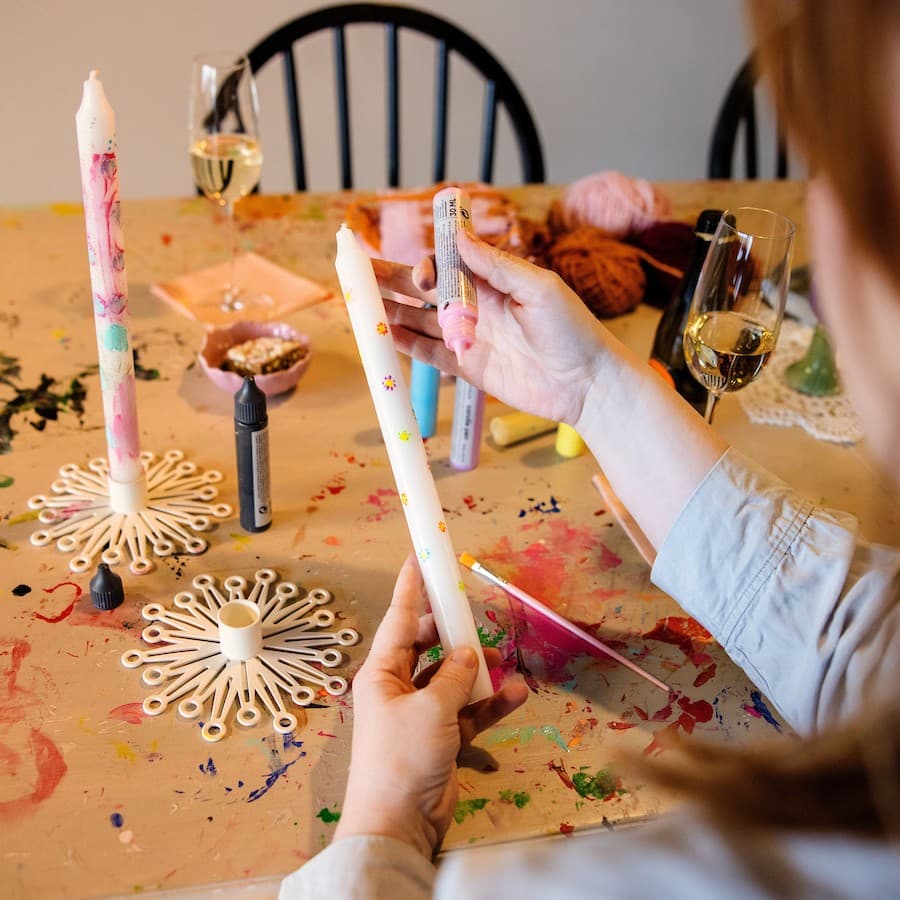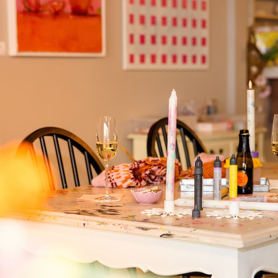 Með föndrinu fylgir notaleg stemning og gómsætar veitingar, við bjóðum upp á kaffi, te, óáfenga og áfenga drykki, kökur og annað góðgæti sem gerir heimsóknina enn notalegri.